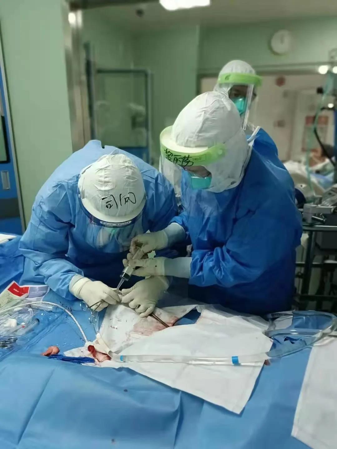 司向副主任医师和黎丽芬副主任医师为患者进行ECMO置管