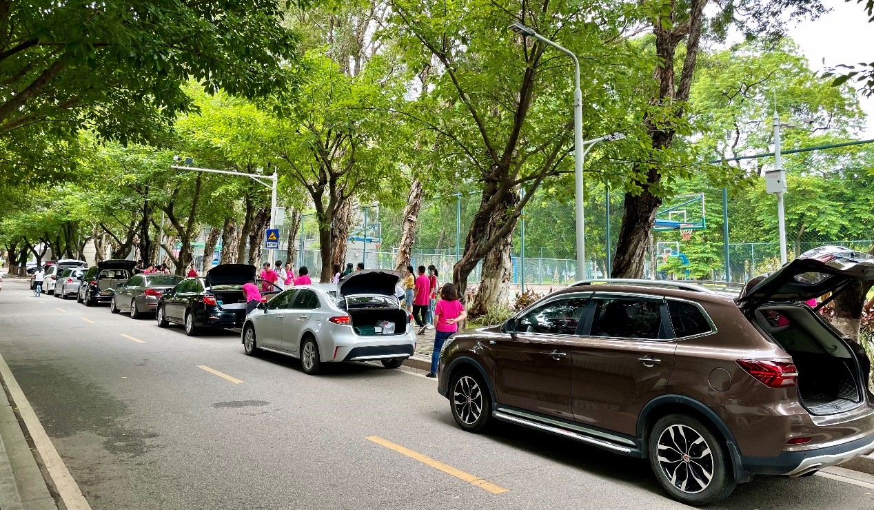 7月16日上午,“法学院教工爱心车队”专门为学生运输特殊物品。9时许,南校园东区和蒲园区的学生宿舍楼下,整齐停放着两列标识统一、编号有序的车队,筑成了校园里一道亮丽的风景线。教工志愿者坚守在各个班级的上车点,耐心地帮助学生们搬运安置行李、清点数量、装载上车,热心地解答同学们的问题。