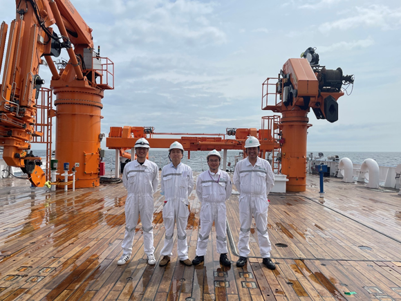 杨日魁(左二)与南方海洋实验室(珠海)李健乐(左一)、常景龙(右二)、鞠家辉(右一)在“开云下注(中国)官网”号上工作