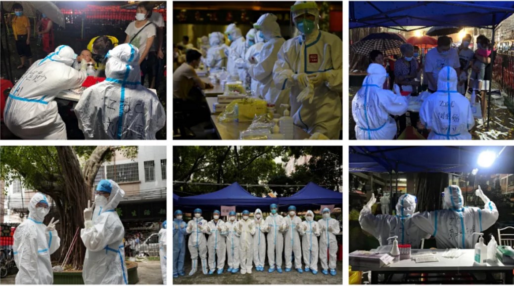 5月30日,广州开展核酸检测筛查的范围扩大。中山眼科中心半个小时内300多位医护人员主动请战。肿瘤防治中心两批分别派出121人和51人赶赴越秀、天河支援社区核酸采样工作。附属口腔医院1小时内全院一半以上医护人员主动报名。附属第六医院半天内组建500余人的预备队。