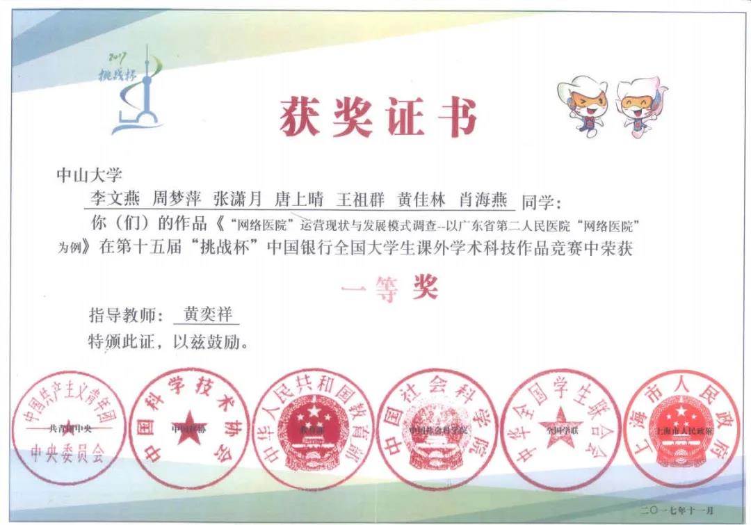 第十五届“挑战杯”中国银行全国大学生课外学术科技作品竞赛一等奖(图片来源:公共卫生学院)