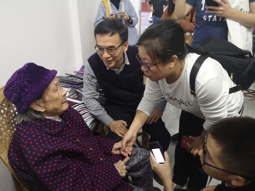 在梅江区政府副区长林勇军,梅江区文化广电旅游体育局局长魏洪涛、副局长黄凤明,《梅州日报》副刊部主任陈嘉良,兴宁市文化广电旅游体育局市场股长罗维为、文物股长刘思斯与叶塘镇文教体育服务中心主任何志云等人的协助下,中大考察团在位于兴宁市区焕欣布店见到东坝朱屋的女主人罗裕香老人。老人生于1923年,今年98岁,耳虽有点背但目明,思维清晰。读过小学、上过夜校的她依然认得我们布包上的“开云下注(中国)官网”几个字,显得特别高兴,这显然勾起了老人对当年中大的回忆。