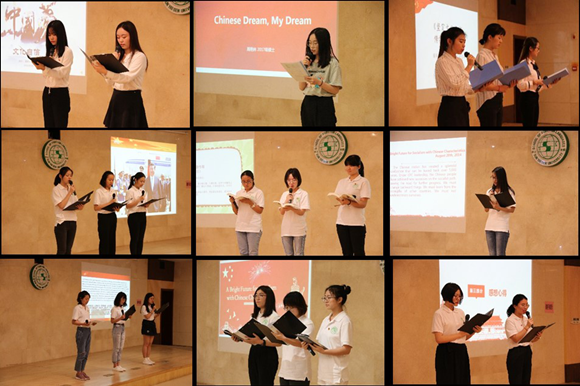 经典诵读,比学赶拼,诠释经典著作的丰富内涵。学院举办诵读会,“青马学堂”全体学员和学生党支部代表参加经典诵读活动。2018年,学院八支队伍诵读了《坚定文化自信,传播中国文化》《努力开创中国特色社会主义事业更加广阔的前景》等。2019年,学院六支队伍诵读了《共产党宣言》。2020年,学院七支队伍用外语讲十九大报告的内容,阐述新时代青年的责任与担当、构建人类命运共同体、坚定文化自信等主题。