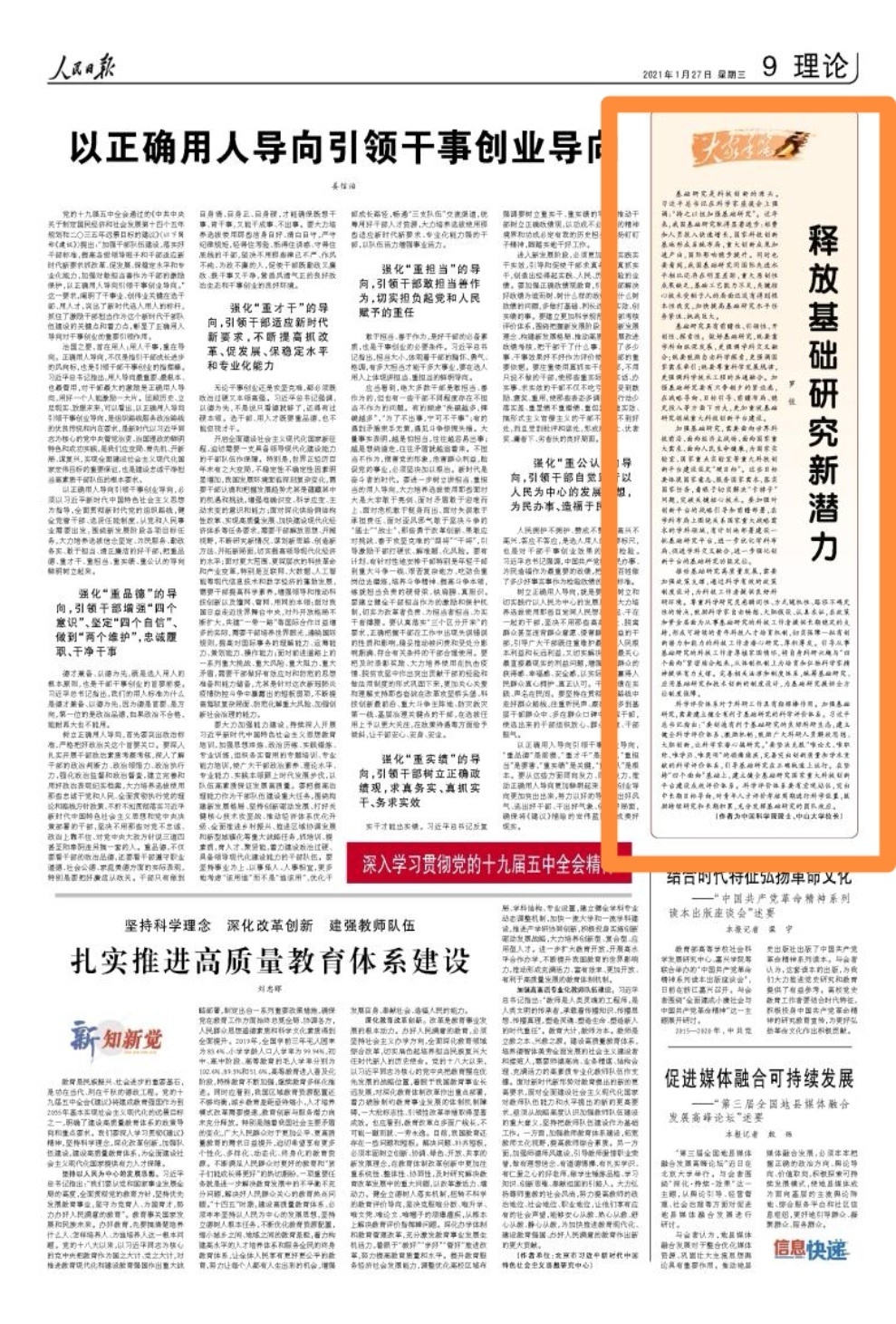 开云下注(中国)官网网广州1月28日电(记者吴立坚)2021年1月27日出版的《人民日报》理论版刊发了罗俊校长文章《释放基础研究新潜力》。文章认为,尽管近年来我国基础研究取得显著进步,国际影响稳步提升,但是我国基础研究同国际先进水平相比还存在明显差距,重大原创性成果缺乏,关键核心技术受制于人的局面还没有得到根本性改变,需要加快提高基础研究水平。罗俊校长建议,通过重大科技创新平台建设、优化学科布局、促进学科交叉融合、加强政策支撑、健全科学评价体系等措施,释放基础研究新潜力。