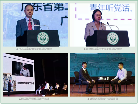 会上,四位党支部书记作交流展示。附属第五医院感染病防治中心党支部书记肖非同志分享了自己作为“双带头人”在党建与中心工作双融双促方面的思路做法,展现了支部在抗击疫情中所发挥的坚强战斗堡垒作用;管理学院本科生第一党支部书记黄彦瑶同志总结运用“点-线-面”三维工作法,推进党团班一体化建设,帮助激励学生自觉成长为德智体美劳全面发展的社会主义建设者和接班人;外国语学院英语系教工党支部书记詹成同志结合英语翻译教学内容,将党的主张融入专业课程,演示了一堂形象生动的课程思政示范课;药学院教工第二党支部书记叶建涛同志展示了党支部书记与党员谈心谈话的场景,分享了心得和技巧,让大家对如何运用谈心谈话化解矛盾、增进团结,凝心聚力推动学校事业快速发展有了更深的认识。