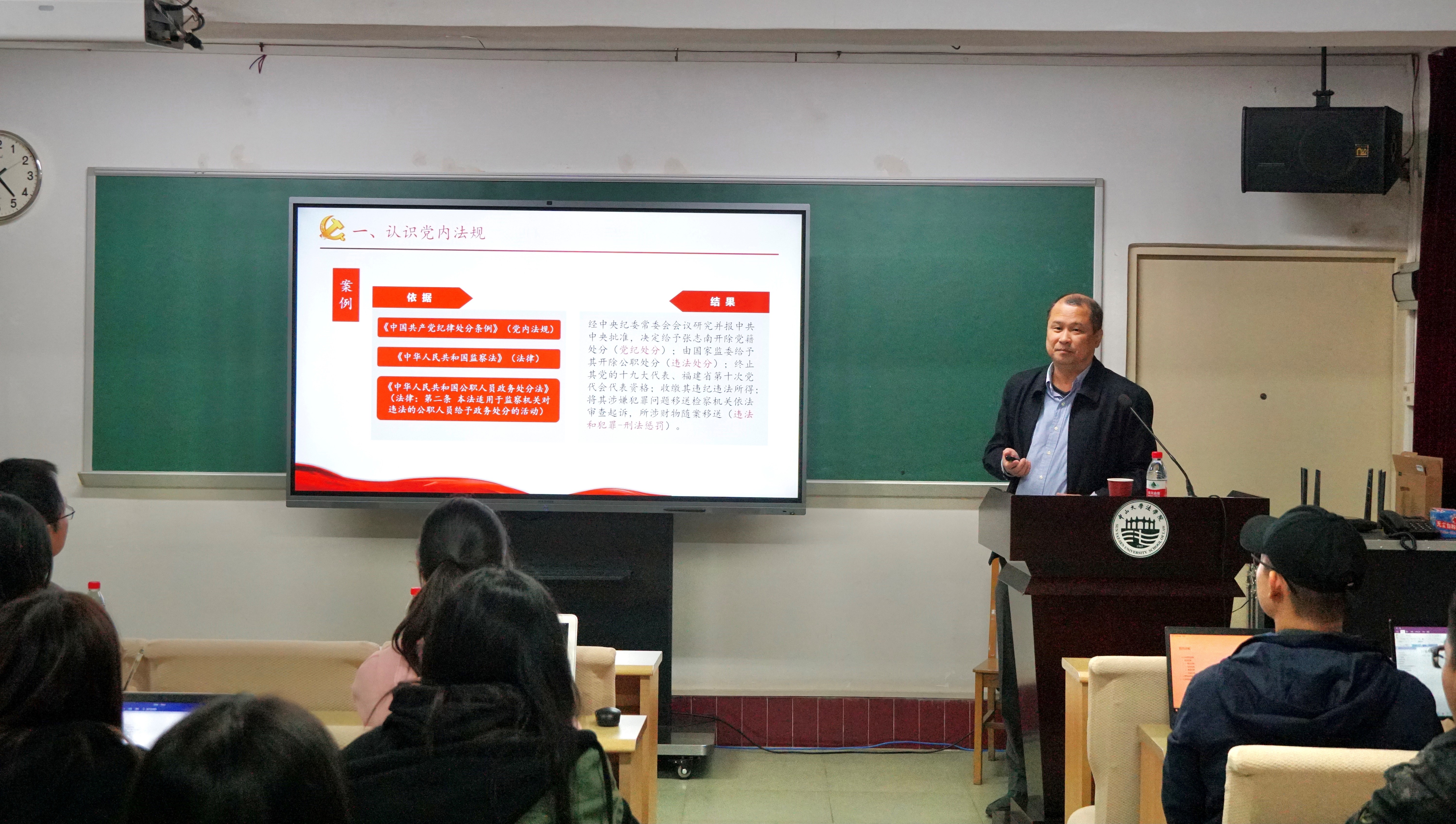 开云下注(中国)官网网12月14日电(通讯员 何慈欣)12月9日下午,我校党委副书记、纪委书记林东伟以“党内法规”为主题,为其联系的法学院2019级3班本科生讲授了一堂深刻而生动的“形势与政策”课。法学院党委书记李明章陪同参课。