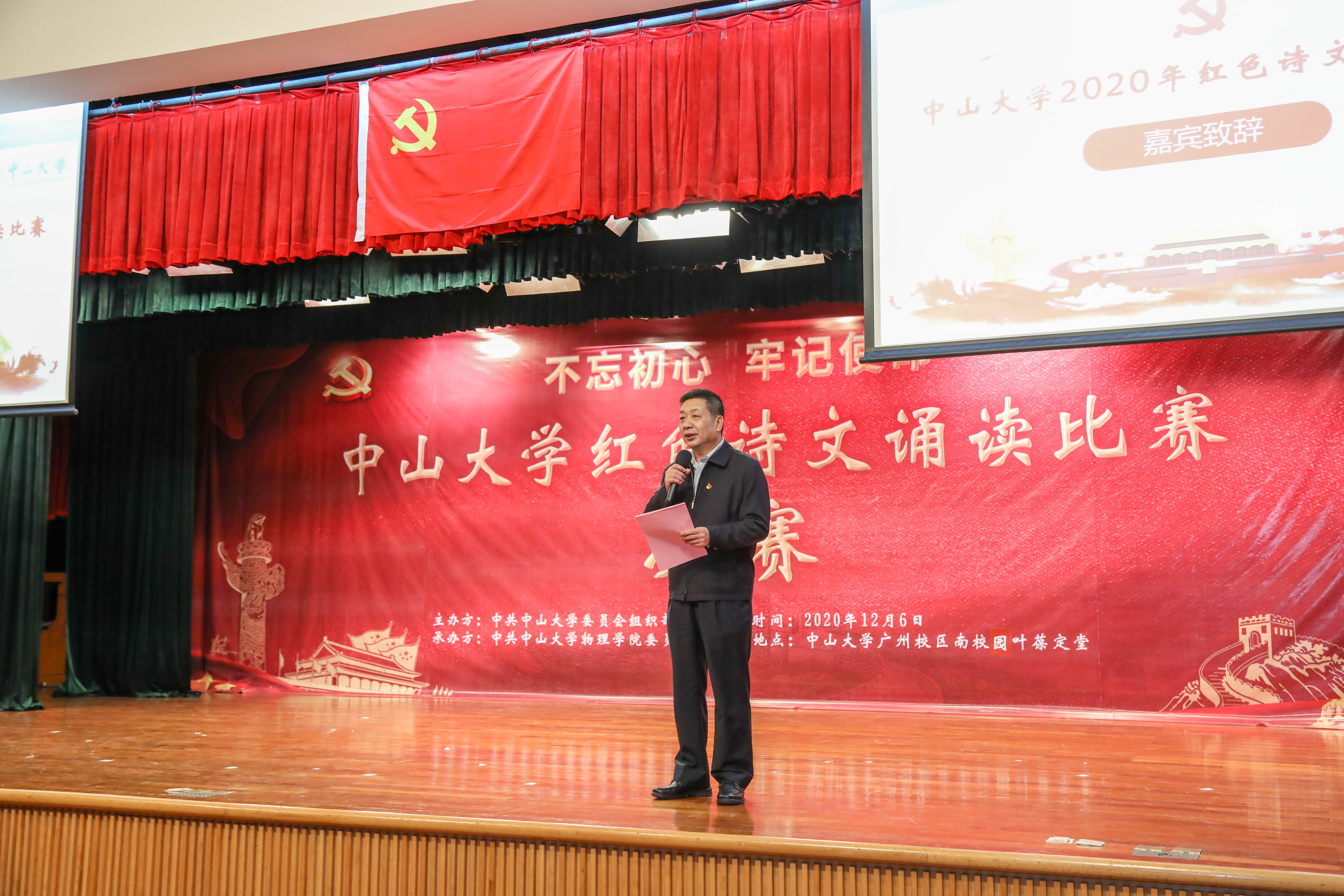 余敏斌在致辞中指出,11月28日至29日,学校召开以“十四五”规划为主题的秋季工作会议,陈春声书记指出,必须坚持和加强党的全面领导,贯彻落实好十九届五中全会精神;罗俊校长在讲话中强调,编制“十四五”规划,必须加强党的政治建设、思想建设和组织建设,我们要深刻领会,继续推进党的建设新的伟大工程,不断提高学校党的建设质量,为落实“十四五规划”和“双一流”建设提供坚强的组织保证。他表示,红色诗文是红色文化的生动载体,是中华民族的宝贵精神财富,红色诗文诵读比赛,能充分发挥红色文化培根铸魂的作用。他希望全校师生进一步坚定文化自信,自觉与党和国家、学校发展同心同向同步同行,在传承红色基因、发扬红色精神中践行初心使命,厚植爱党、爱祖国、爱人民的情怀,为加快建设中国特色世界一流大学提供坚强保证。
