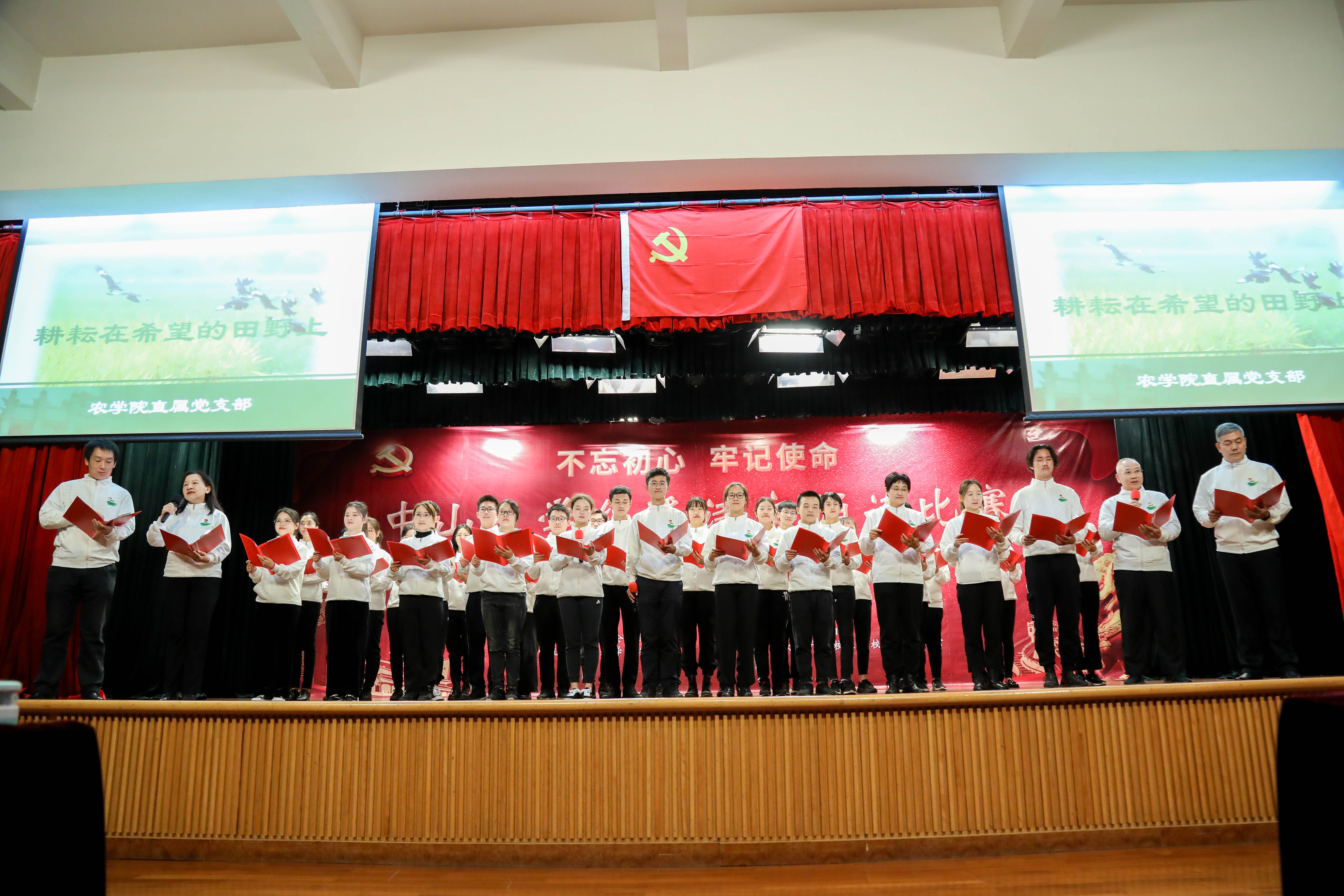 农学院直属党支部的《耕耘在希望的田野上》率先登上舞台,着重描绘在党的领导下,改革开放以来,我国农业生产、农村面貌和农民生活发生的翻天覆地的变化,热情讴歌了我国农业改革、脱贫攻坚、乡村振兴的伟大创举。