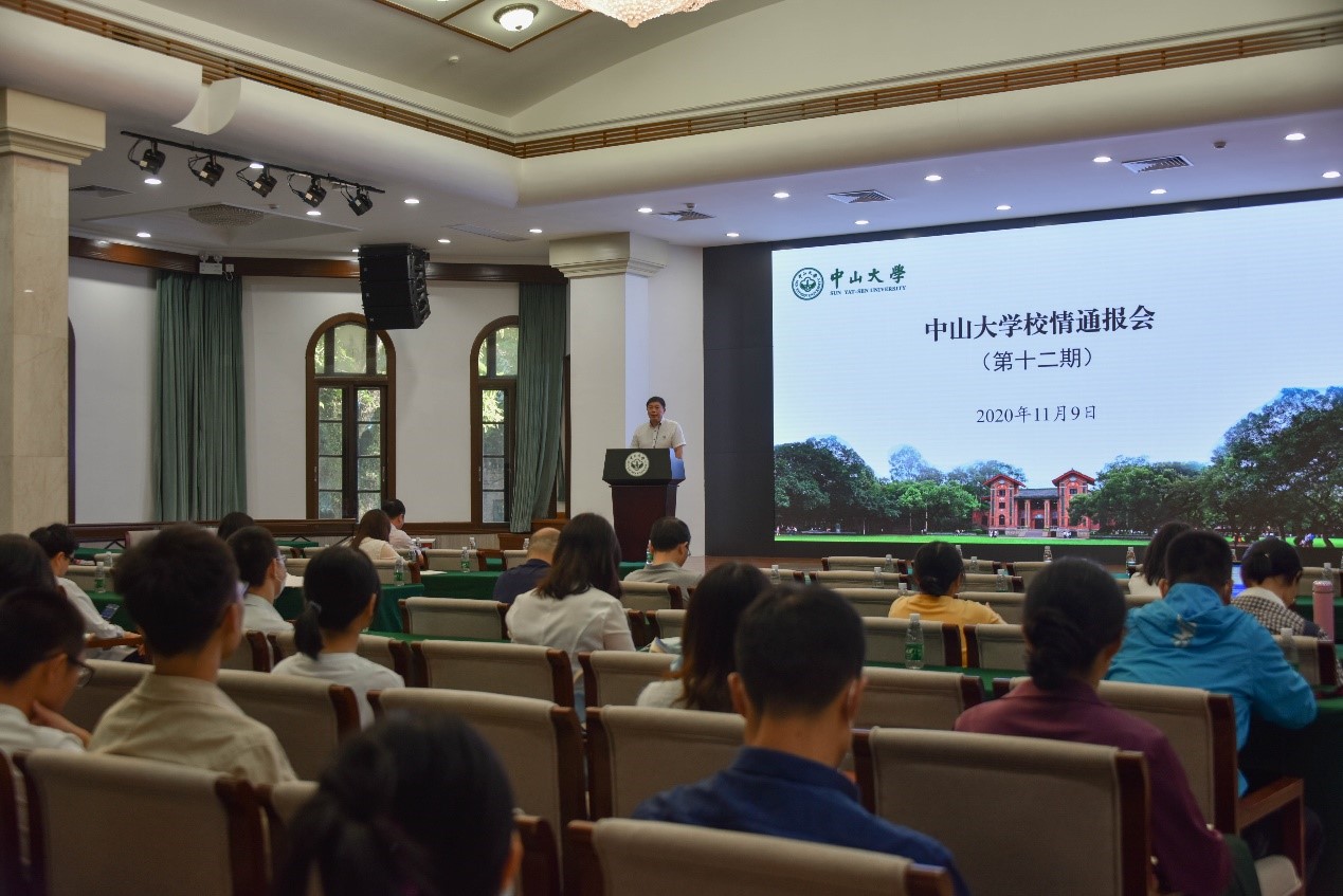 通报会首先通报了我校开展深入学习贯彻《习近平谈治国理政》(第三卷)的有关情况,以及陈春声书记、罗俊校长为本科生教授思想政治理论课的情况。对于我校近期的校情,通报的内容主要包括:院系学科建设与“十四五”规划调研;院长、书记、职能部门负责人履职能力培训;对口支援进展;精准扶贫“三个三”工程;我校2020年软科中国最好学科排名、USnews学科排名;我校2020年国家自然科学基金项目集中接收期立项情况;精准医学科学中心自动化生物医学样本库正式投入运行;思想政治理论课双聘教师和兼职教师培训系列活动;师德建设主题月活动;学生工作相关制度;财经纪律宣讲培训;“制止餐饮浪费 培养节约习惯”-光盘行动;校园建设工作进展等师生普遍关注的19项情况。