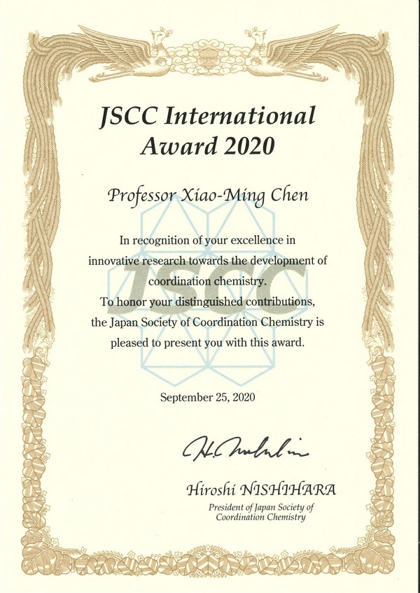 2020年JSCC奖(日本配位化学会国际奖)奖状(来源:化学学院)