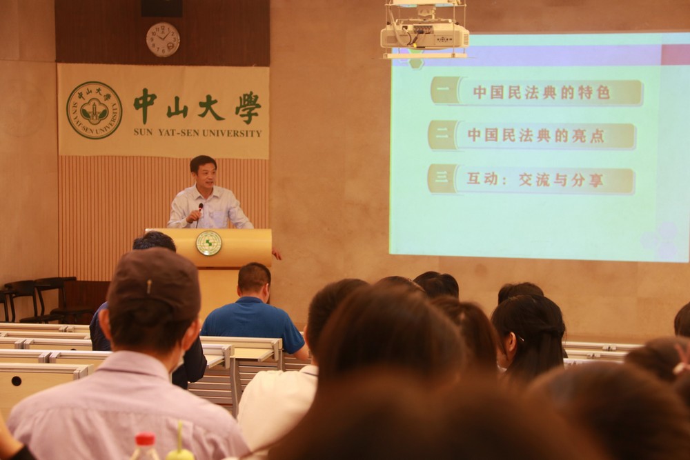 于海涌教授紧密围绕《中华人民共和国民法典》,结合生活实例,旁征博引、深入浅出地为大家解读和阐释了民法典的特色和亮点。他指出,《中华人民共和国民法典》的立法时间之长、规模之大、法律条文之多,以及以“法典”命名,都很值得从学术层面、法理层面、实操层面去学习、去研究。《民法典》也是与我们每个人的生活极为息息相关的法律,于教授风趣幽默地联系个人经历和新闻时事,介绍了不动产统一登记、住宅用地期限届满的续期问题、居住权、情势变更等九大亮点,并在交流和分享环节,回应了师生提出的疑惑。