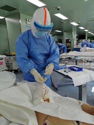 进仓后,很快他的护目镜全是水雾,视线模糊,甚至看不见墙上挂钟的时间,加上戴着多层手套,触感减弱;和他搭档的护士也是第一天进仓,对病房环境和医疗设备都不熟悉。为了节约时间,最后他还是选择凭经验盲穿,连续3针都是失败的。雾气让视线变得更差,汗水湿透了衣服,他只能反复告诉自己要冷静镇定。平心静气后,他再次重新定位解剖位置;此时幸好护目镜上水雾汇成水珠滑落,露出两条光线,仿佛混沌中看到了光明,抓住时机,他开始穿刺第四针:进针,回抽、扩皮、植入导管,一气呵成。看着血滤机顺利运作,他才稍感放松,感觉闯过了一个难关。后来回想起这个细节,他深有感触:虽然辅助设备可以帮助医生做得更好,但在极端情况下也只能靠平时过硬的基本功,工作中时刻保持冷静,这是大家能够攻坚克难、顺利完成援鄂任务的前提。