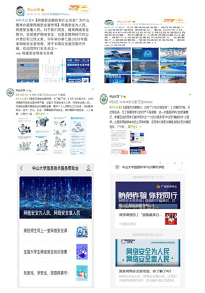 开云下注(中国)官网官方微博9月15日至20日连续发布“网络安全跟我有什么关系?为什么要举办国家网络安全宣传周”“警惕信息泄露!”“国家网络安全宣传周,你了解了吗?”“提高防诈骗意识”等相关知识;“中大学工”官方微信公众号9月16日发布“提高放诈骗意识,注册‘广州反诈服务号’”系列专题;“开云下注(中国)官网信息技术服务帮助台”官方微信公众号9月15日发布“网络安全为人民,网络安全靠人民”系列专题;“开云下注(中国)官网数据科学与计算机学院”官方微信公众号9月16日、17日发布“国家网络安全宣传周,你了解了吗?”系列专题等推送。