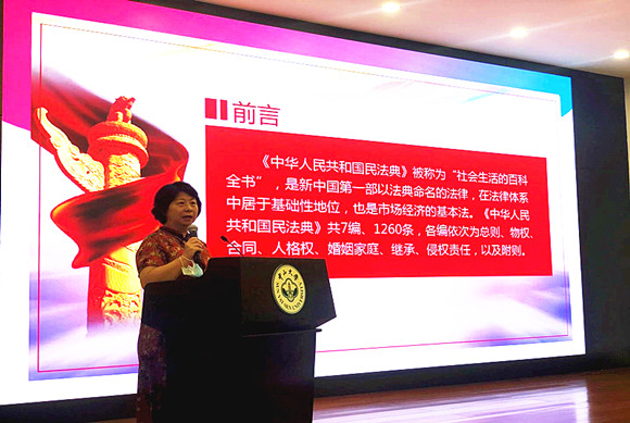 会上,法学院卓冬青副教授为全体代表作了“民法典婚姻家庭编之新规”专题培训,她从婚姻家庭法的新规定、司法解释和修改等方面解释了民法典涉及婚姻家庭的一些重要规定。与会者表示普法培训深入浅出、解释清晰,对于进一步深入学习民法典具有很强的指导意义。