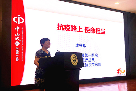 附属第一医院护理部主任、援鄂医疗总队临时党总支书记、援助塞尔维亚抗疫专家组成员成守珍同志作抗疫先进事迹报告(来源:校工会)