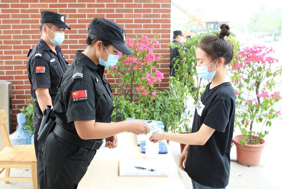 本次演练共设有两个模拟情境,分别模拟学生返校可能出现的不同场景以及发现发热学生的应急处置。本次学生返校模拟演练中,校园防范措施严格,在校园入口处依次设立体温检测区、口罩更换区、健康教育区、应急处置区和临时隔离区。工作人员在校门口对学生的健康码进行查验,核对其身份并检测体温。体温异常的学生由安保人员引至临时隔离区,并由医生测量学生腋下体温,询问症状及流行病学史等。