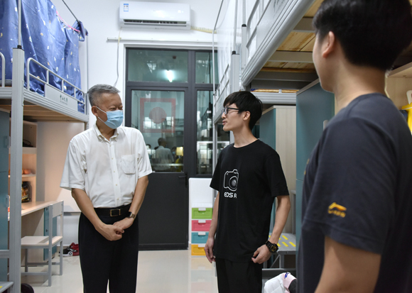 陈春声书记亲切询问同学们进驻宿舍后的生活情况。同学们普遍认为,宿舍宽敞明亮,通风条件好,家具质量高,对深圳校区提供的住宿条件感到满意。陈春声书记谈到,校区还有大楼在建设,校园在不断完善,同学们是深圳校区建设的见证人,希望大家努力学习深造,与深圳校区共同成长。同学们要热爱劳动,做好宿舍卫生和疫情防控,保持身体健康。走访宿舍时,一位入党积极分子正在写思想汇报,陈春声书记鼓励他继续积极向党组织靠拢。