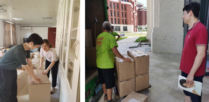 教职工在海滨红楼15号打包物资(左)、在海琴6号搬迁现场(右)(来源:中文系(珠海))