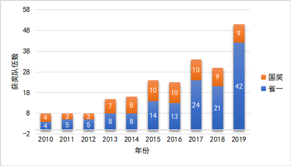 近十年我校学生获得全国大学生数学建模竞赛重要奖项队伍数统计图(图片来源:数学学院)