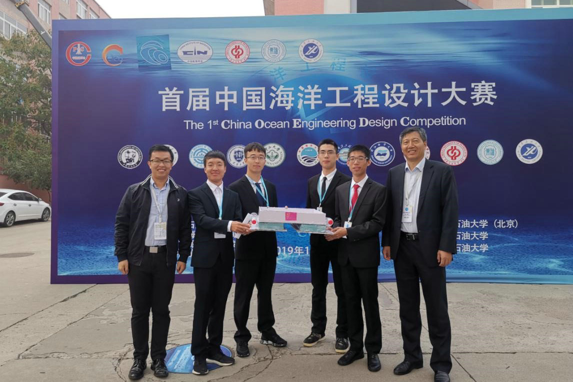 谢鹏副教授(左一)指导2017级本科生参加首届中国海洋工程设计大赛并获全国赛二等奖(来源:海洋工程与技术学院)
