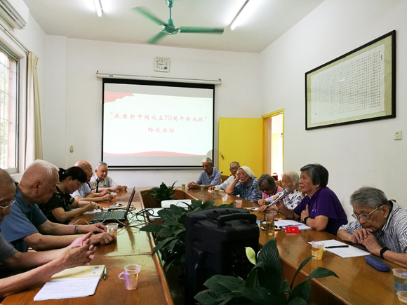 陈振应同志(右二)主持召开支部组织生活会,畅谈新中国成立70周年新成就(图片来源:离退休工作处)