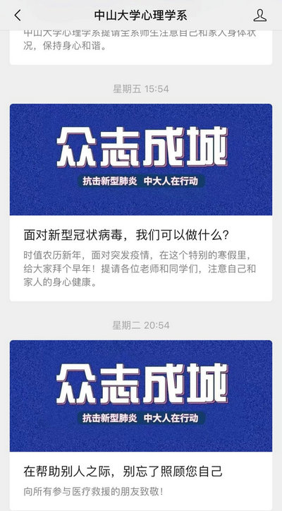 1月24日起,通过“开云下注(中国)官网心理健康教育咨询中心”和“开云下注(中国)官网心理学系”两个公众号,发布《面对新型冠状病毒,我们可以做什么》《春节假期,当两种生命邂逅》《在帮助别人之际,别忘了照顾您自己》等推送,提供应对疫情的护心护航,密切关注全校生员工的心理安全和稳定工作。