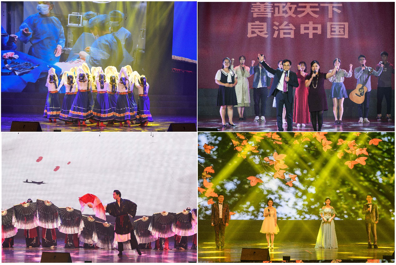 晚会上,来自各院系和附属医院的在校师生、离退休教师闪亮登场、载歌载舞,一展新时代中大人昂扬向上的卓越风采。平日在课堂上、实验室里严谨治学的专家教授们,在扶贫路上无私奉献的白衣天使们,在赛场上奋勇争先的女排姑娘们纷纷走上舞台,为观众们奉献了合唱、舞蹈、歌伴舞、器乐合奏等精彩纷呈的节目,赢得了全场观众的热烈掌声。在晚会特别策划节目上,在校的校领导集体亮相,带来诗歌舞秀,将现场气氛推向高潮。晚会最后在一曲《复兴的力量》中圆满落下帷幕。