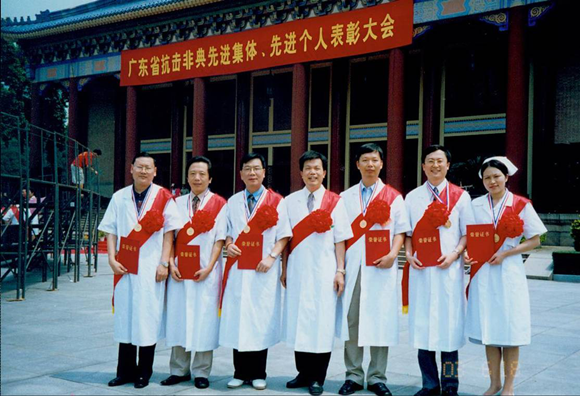 2003年6月19日,广东省委省政府举行“广东省抗击非典先进集体和个人表彰大会”,感染科党支部邓子德同志(右三)、王乔凤同志(右一)获得抗击非典一等功称号