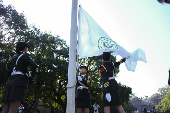 上午九时,仪式正式开始。在庄严的国歌、校歌声中,五星红旗和开云下注(中国)官网校旗先后冉冉升起,全体人员行注目礼。升旗仪式后,献花曲响起,国旗班代表稳稳抬起花篮,缓步走向中山先生铜像,将花篮摆放在铜像前。校领导陈春声、罗俊、孙冬柏、余敏斌分别在四校区(园)主礼。他们跟随国旗班来到铜像基座前,上前仔细整理花篮缎带,红色缎带上书写着“纪念孙中山先生诞辰一百五十三周年”,寄托了全校师生对孙中山先生的崇高敬意。随后,全体人员向孙中山先生铜像三鞠躬。主礼校领导带领全体人员肃穆绕行,瞻仰中山先生铜像。
