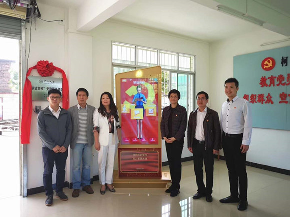卜熙(左一)及其团队在学校扶贫点柯木湾村捐赠“移动党校”