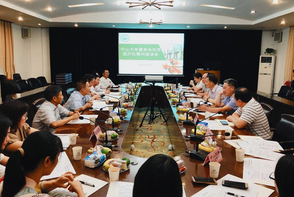 9月4日下午,我校在北校园大外宾接待室召开援多米尼克医疗队阶段总结暨中秋慰问座谈会。首批援多医疗队杨震、林茂、王风华三位医生及曹乾忠医生家属,第二批队员家属代表,广东省卫健委交流合作处副处长杨波、省卫生医疗对外合作服务中心主任韦家森一行,我校副校长肖海鹏,相关附属医院负责同志参加座谈会。会议由医院管理处处长傅剑华主持。