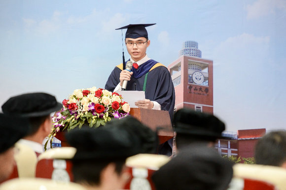 2016级交通信息工程及控制硕士研究生陈新宇代表研究生毕业生发言。他首先感谢智能工程学院的领导和老师,感谢他们为学院的组建和成立付出了巨大的努力。他认为,人工智能和传统工科正面临着急速的融合和发展,为各位毕业生提供了诸多机遇和挑战,希望同学们能够砥砺前行,不忘初心。