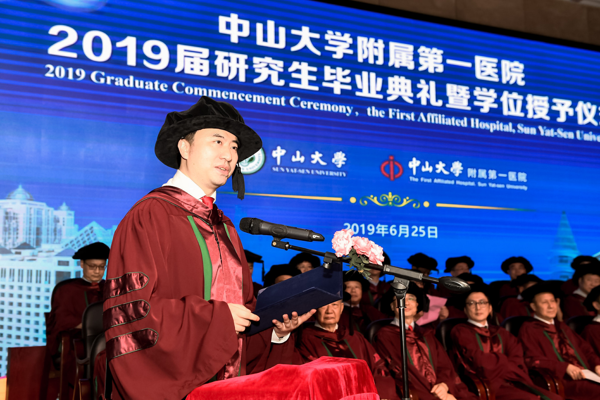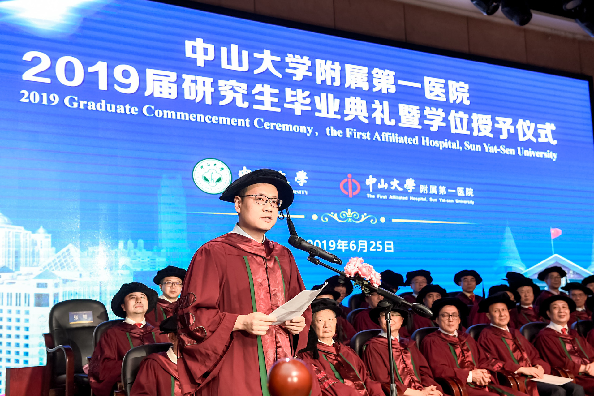 6月25日下午,附属第一医院举行2019届研究生毕业典礼暨学位授予仪式,校党委副书记余敏斌,副校长、附属一院院长肖海鹏,附属一院党委书记骆腾,研究生院院长董文杰及来自香港、澳门、北京协和医院的专家,学校和医院各学科带头人等出席毕业典礼,向200多名硕士、博士毕业生表达了诚挚祝福。