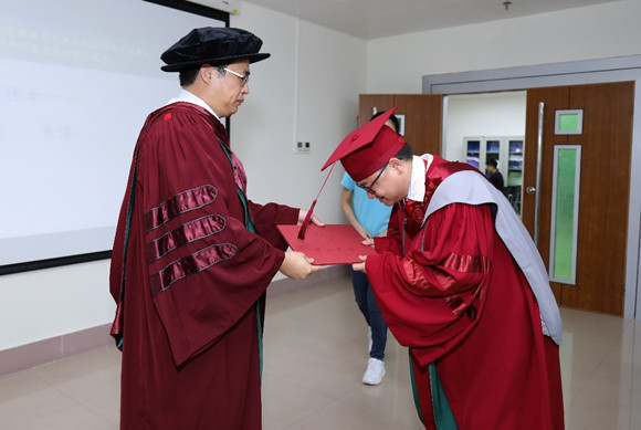 伴随悠扬的《山高水长》音乐,现场的硕士毕业生、博士毕业生逐一上台受礼,院长林伟鹏教授与各位毕业生亲切握手、拨穗并颁发毕业纪念册。