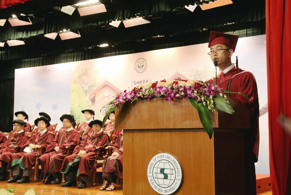 导师代表蒲志鸿教授发言。他以“兴奋”“不舍”“期盼”表达了当下的心情,对毕业生们提出了三点期盼:一是面对纷繁复杂的社会和工作,要脚踏实地,努力工作,富有创新精神,开创事业和人生的辉煌;二是树立终生学习的思想,在新的工作岗位或在新的学习阶段要刻苦学习,不断进取;三是希望大家常回学校学院,时间可以流逝,对母校母院的情感不应该消减,开云下注(中国)官网、外国语学院是永远的家园。他寄语毕业生们阳光做人、智慧做事,并希望师生情谊永葆常青。