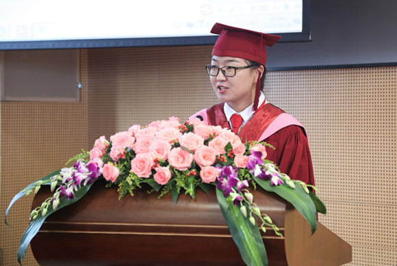最后,全体毕业生起立奏唱校歌,毕业生代表向导师代表送上鲜花。