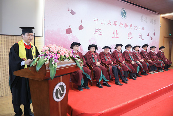 2015级林凯杨同学作为本科生代表在典礼上发言,回望四年的成长经历,让他感触最深的是哲学系对个人理性思维能力的训练与培养,他衷心感谢父母的养育,师长的教诲,并表示要用一生去眷恋中大。他希望哲学系的理性精神与大家一路相随,愿梦想常青,担当常在,无愧于这个时代。