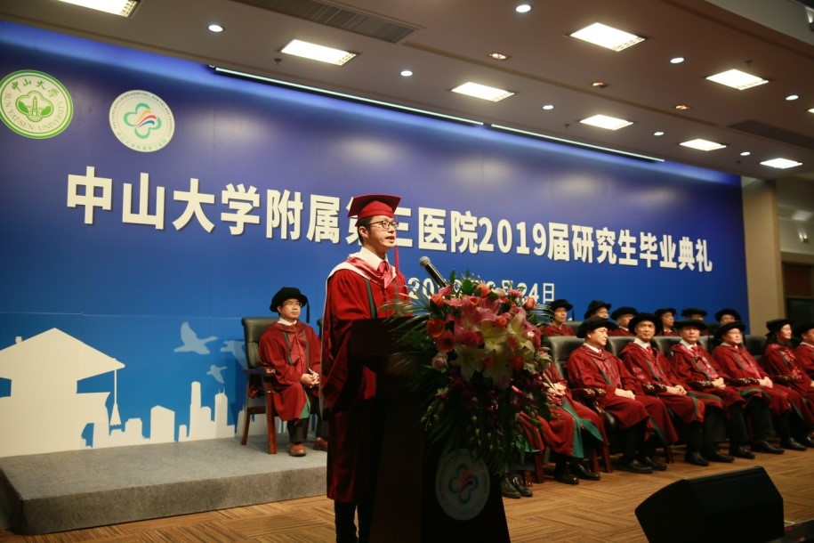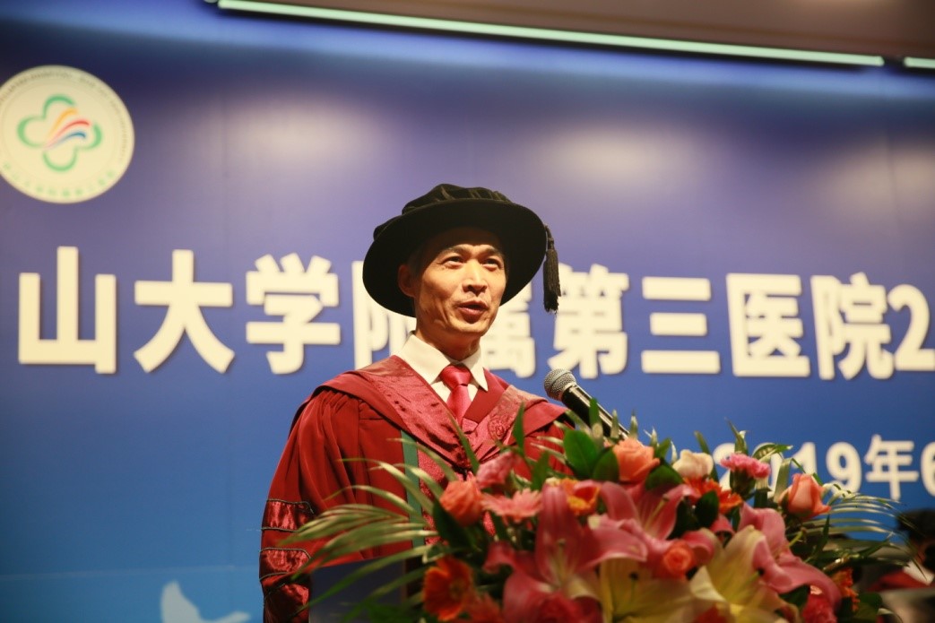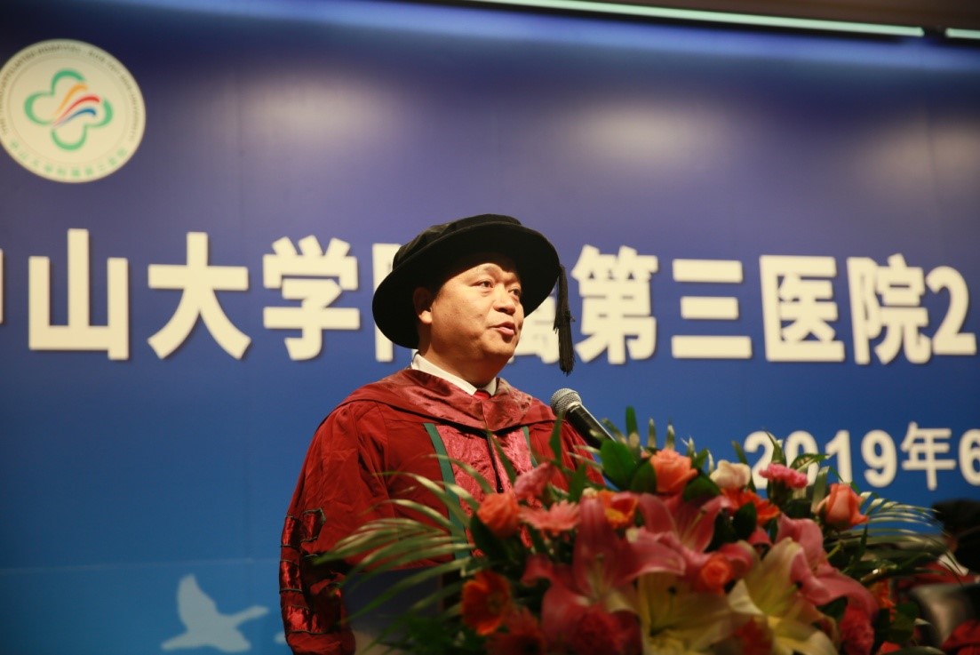 戎利民院长向毕业生送上寄语。他感谢同学们怀着美好的憧憬和对医学知识的渴望步入中山三院,在这里度过了个人成长过程中最为灿烂的时光,感谢同学们见证和参与了医院建设和发展。在依依惜别之际,他对同学们提出三点要求:一是常怀悲悯之心,敬畏生命勿忘初心;二是要有追求事业的执着精神及求真务实的科学精神;三是要珍惜三种财富:健康体魄、纯真友谊和三院文化。