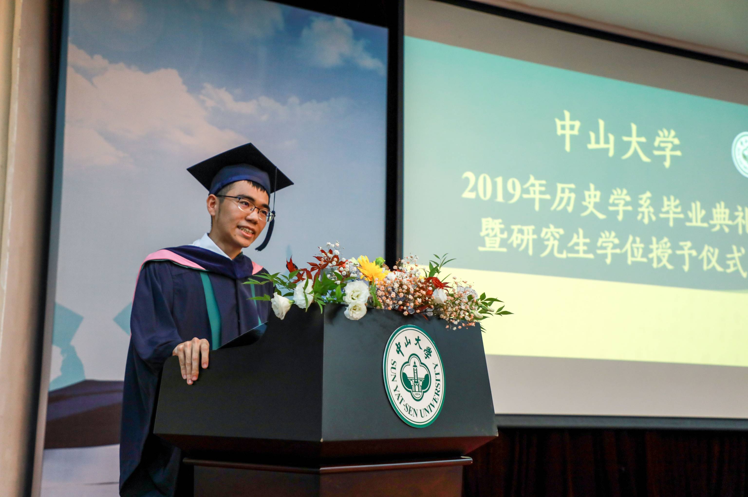 2019届中国史硕士 贾继航:来康乐园求学三年,在历史学系度过了三个寒暑,如今终于到了离别的时候了。感谢中大为我们筑好了梦想的平台,让我们顺利地滑行起飞;感谢历史学系的老师们传道授业,呵护我们的成长。奋斗的青春最美丽,选择历史,终身无悔。祝福三年里遇到的每一个老师和同学,谢谢你们。一切恍如昨日,再看一眼陈寅恪先生的铜像,我们真的要走了。愿你们历尽千帆,归来仍是少年。
