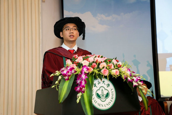 随后,毕业生代表肖棣文同学向德高望重的夏老献花并发言。他在发言中表示,求学生涯给自己打下“求真务实”和“独立自信”的中大学人印记,代表毕业生向政治与公共事务管理学院的老师致以真挚地感谢,并表示将不忘初心,与全体毕业生一起铭记教诲,砥砺前行。