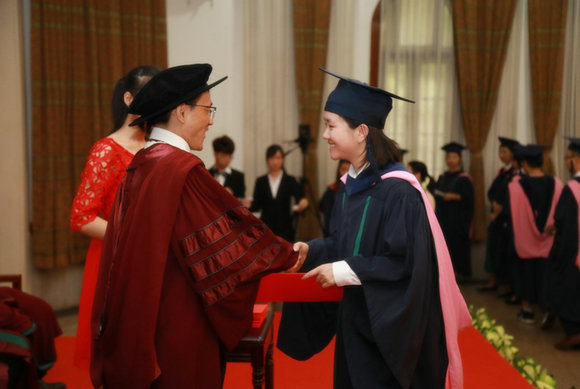 在《山高水长》悠扬的乐曲声中,2019年学位授予仪式正式开始,毕业生逐一走向主礼台,谭安奎院长为获得学位的学生授予毕业纪念册,并合影留念。