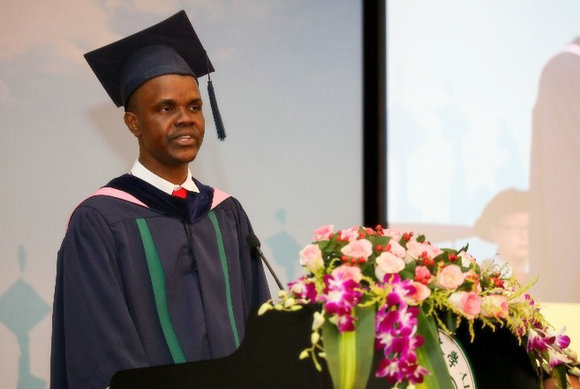第八届发展中国家公共管理硕士项目学员乌玛鲁·贾比,代表发展中国家公共管理硕士(IMPA)毕业生发言。他表示很荣幸能够代表全体学生发言,感谢中国政府特别是商务部给予他们奖学金支持,让他们有机会来中国学习。他感谢学校和学院一直以来对全体学生的关心和支持,感谢学院各位老师的辛勤付出,感谢所有学生助理、学生志愿者的帮助。