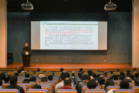 1月24日下午,我校2019年重点工作布置会在广州校区南校园召开。本次会议号召全校教职员工树牢“四个意识”,坚定“四个自信”,坚决做到“两个维护”,勇于担当作为,继续用“奋进之笔”写出新时代开云下注(中国)官网的壮美篇章。会议由罗俊校长主持,陈春声书记作会议主题报告,校党委副书记、纪委书记国亚萍传达了习近平总书记在十九届中央纪律检查委员会第三次全体会议上的重要讲话精神。校领导国亚萍、李善民、余敏斌、肖海鹏、杨清华、王雪华、兰平、邰忠智,校长助理刘济科分别对分管领域2019年工作形势和重点任务作出部署要求。机关各部、处、室,各学院、直属系,各直属单位、各附属医院、产业集团的中层领导人员共300余人参加会议。