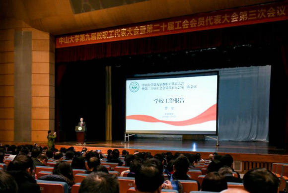 1月9日上午,我校第九届教职工代表大会暨第二十届工会会员代表大会第三次会议在广州校区南校园梁銶琚堂召开。校长罗俊,校领导孙冬柏、国亚萍、李善民、余敏斌、王雪华、兰平、邰忠智,校长助理宋珊萍、祁少海、刘济科出席会议,王复明院士列席会议。会议由校党委副书记、工会主席余敏斌主持,60个“双代会”代表团的400余位正式代表和列席代表参加会议。