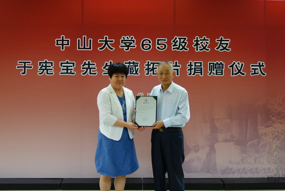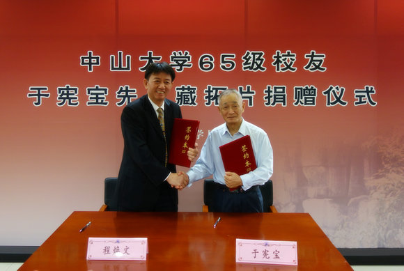 于宪宝先生1965年至1970年就读于我校历史系,毕业后曾先后任英德市博物馆馆长、市方志办主任、市政府办公室副主任、市文管会办公室主任等职。值学校94周年校庆之际,于宪宝先生决定将其数十年捶拓之英德本地拓片悉数捐予母校图书馆。这批拓片共470件533张,以南山、碧落洞等地摩崖为主,同时又有少量碑刻,及砖铭、石鼓铭、钟铭、墓券铭、楹联、桥梁题字、祠堂木匾等,具有重要的学术和文物价值。
