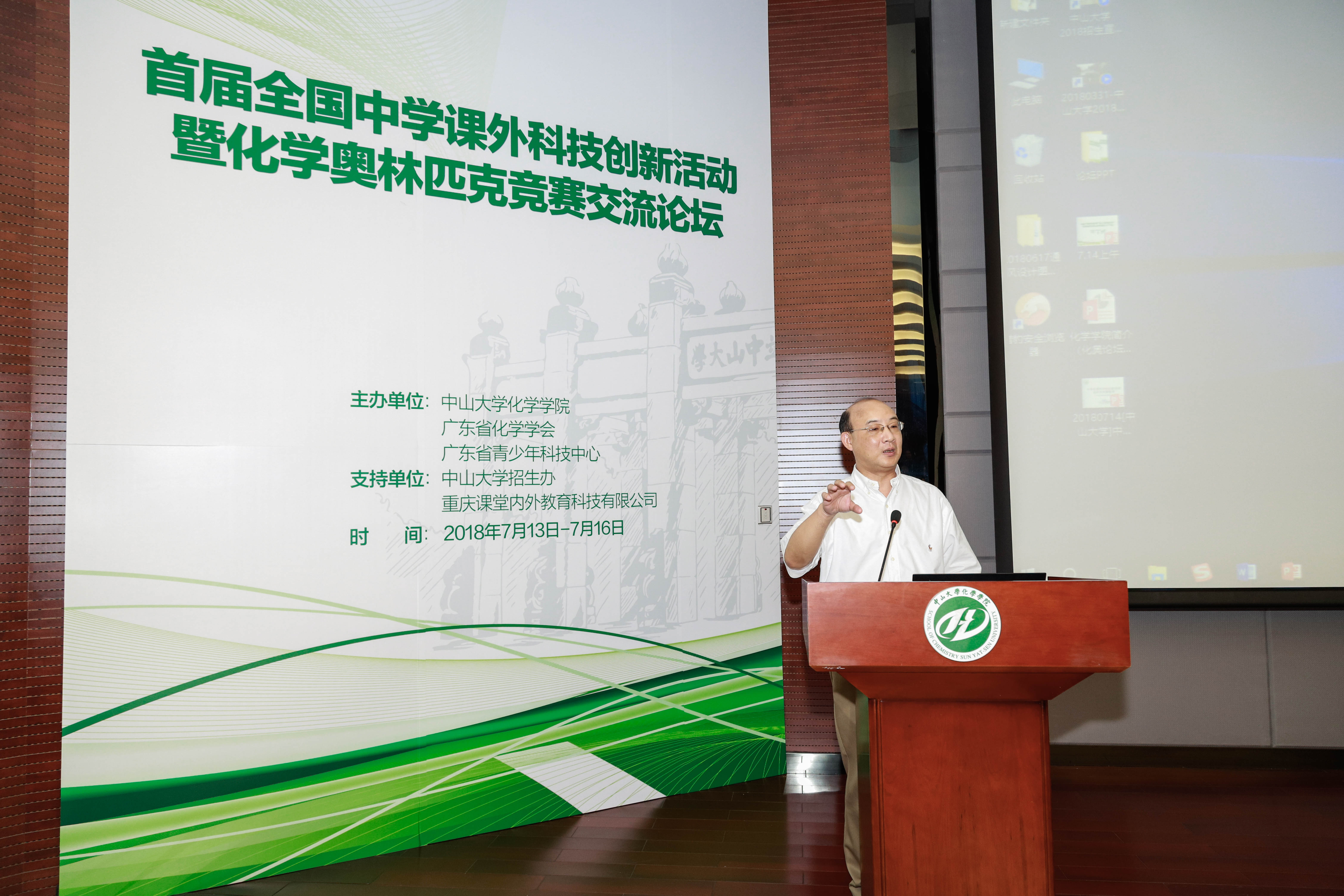 7月14日上午,由我校化学学院、广东省化学学会和广东省青少年科技中心联合举办的首届全国中学课外科技创新活动暨化学奥林匹克竞赛交流论坛在化学学院大楼丰盛堂隆重开幕。我校副校长黎孟枫,广东省青少年科技创新大赛组委会副秘书长、广东省青少年科技中心主任叶新鹏,学校教务部招生办公室主任刘泽炀,学校教学实验中心主任陈六平,广东省化学学会理事长、化学学院院长毛宗万,化学学院副院长、化学实验教学中心主任巣晖,物理实验教学中心主任蔡志岗以及学校多位院系领导出席本次论坛开幕式。全国各省市近百所重点中学100多位领导和老师参加了本次交流论坛。