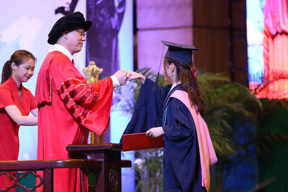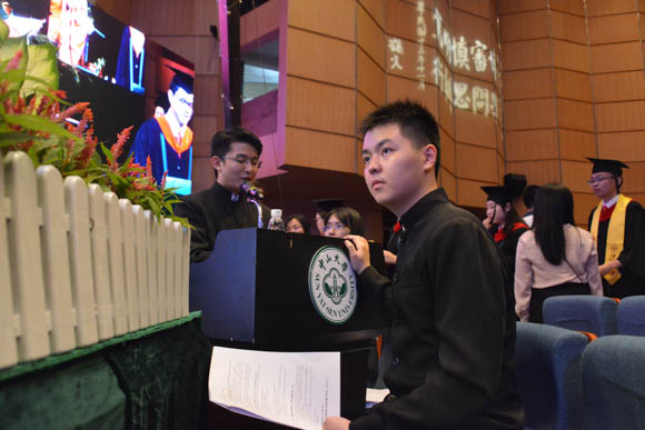校歌奏响的那一刻,管理学院本科毕业生钟舒敏站得更挺立了,她既感动又骄傲,她说,每每唱出“吾校矗立,蔚为国光”,便更能感受到“家国情怀”所赋予的使命感,以及“领袖气质”所给予的自信心!当初“力排众议”选择中大,而今证明自己的选择是无比正确的。“四年前我以中大为荣,希望未来中大能以我为荣!”