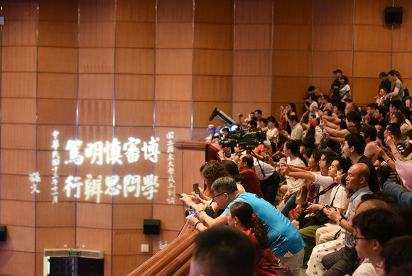 随着黄天骥教授手执权杖缓缓步入会场,全体毕业生神情庄重,注目行礼,并欢呼鼓掌。银色的权杖辉映着仪式的庄严和神圣,学子们的欢呼又让仪式洋溢着青春的气息。来自不同院系的学子将在权杖的见证下,完成这次庄严而美好的毕业洗礼。