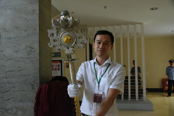 权杖和毕业证对外国语学院的博士毕业生李忠华来说都意义重大,他在中大走过了七年的漫漫求学路:“我是2004年在外院拿到了硕士学位,去了东莞理工学院教书,社会对大学老师知识水平和科研能力的要求不断提高,我发现自己需要充电,于是在2011年做出了入学读博的决定。”这对担任行政职务的他来说是个很大的挑战,不过今天他终于顺利毕业了!“我硕士毕业的时候还没有这么隆重的毕业盛典,今天是我第一次看见庄严华丽的权杖,心情很激动。我毕业后将回到教师的岗位上,权杖的精神会鼓励着我向更高层次的学术进发。”李忠华开心地说。