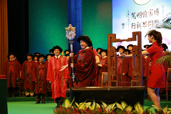 中国语言文学系黄天骥教授一直担任权杖教授。 “学校每年都会邀请一位资历较深的教师来担任权杖教授,能够连年担任,我很高兴也很自豪。中大权杖是中文系校友捐赠的,是校友情系母校的象征,虽然在概念上参考了港大,但它的贵重和精美以及它对于中大的意义都是独一无二的。它代表着学术的圣洁、学校的荣誉和教师的责任,具有非凡的神圣感、使命感和庄严感,所以即使我现在年纪很大了,每一次举起权杖,我也还是会很注意自己的仪态,尽力展现出权杖教授应有的风度。”黄教授说,“今天又有一批学生毕业,我心里很是依恋,不论他们选择就业还是继续深造,我都希望他们能够克服人生路上的困难,发扬中大精神,努力进取,有所成就,相信光明的前途正等着他们!”